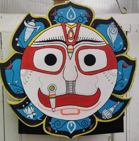 I spent 6 months in India in 1994 (could have been 1993). I stopped in Puri for a while and was impressed by the representations of the Jagannath triad. Balabhadra (known by many names and crossing religions) is the older brother of Vishnu and his companion in the tales of the Mahabarata. He is the god of agriculture and strength, a protector and supporter of dharma. I made this for me, I'm not sure whether to sell it or not but if someone wanted me to make something like this for them I could, the price listed is a guide price for something of this sort. Acrylic on wood 60cms (24 inches) diameter.