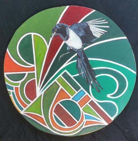 I'm a big fan of magpies and the crow family in general. Much folklore and many myths surround the magpie, more so than many other birds. They are message carriers from the spirit world, they are notorious thieves of pretty, shiny things, they have their own rhyme that has many regional variations. they are seen as rogues in the bird world. Intelligent, able to recognise their own reflection, which is a rarity in the animal kingdom, they are subject to suspicion and sometimes known in a group collective as a mischief of magpies . I worked for several years for a company called Magpie, I identified with the label. This is an acrylic painting on wooden board. Approx. 60cms diam